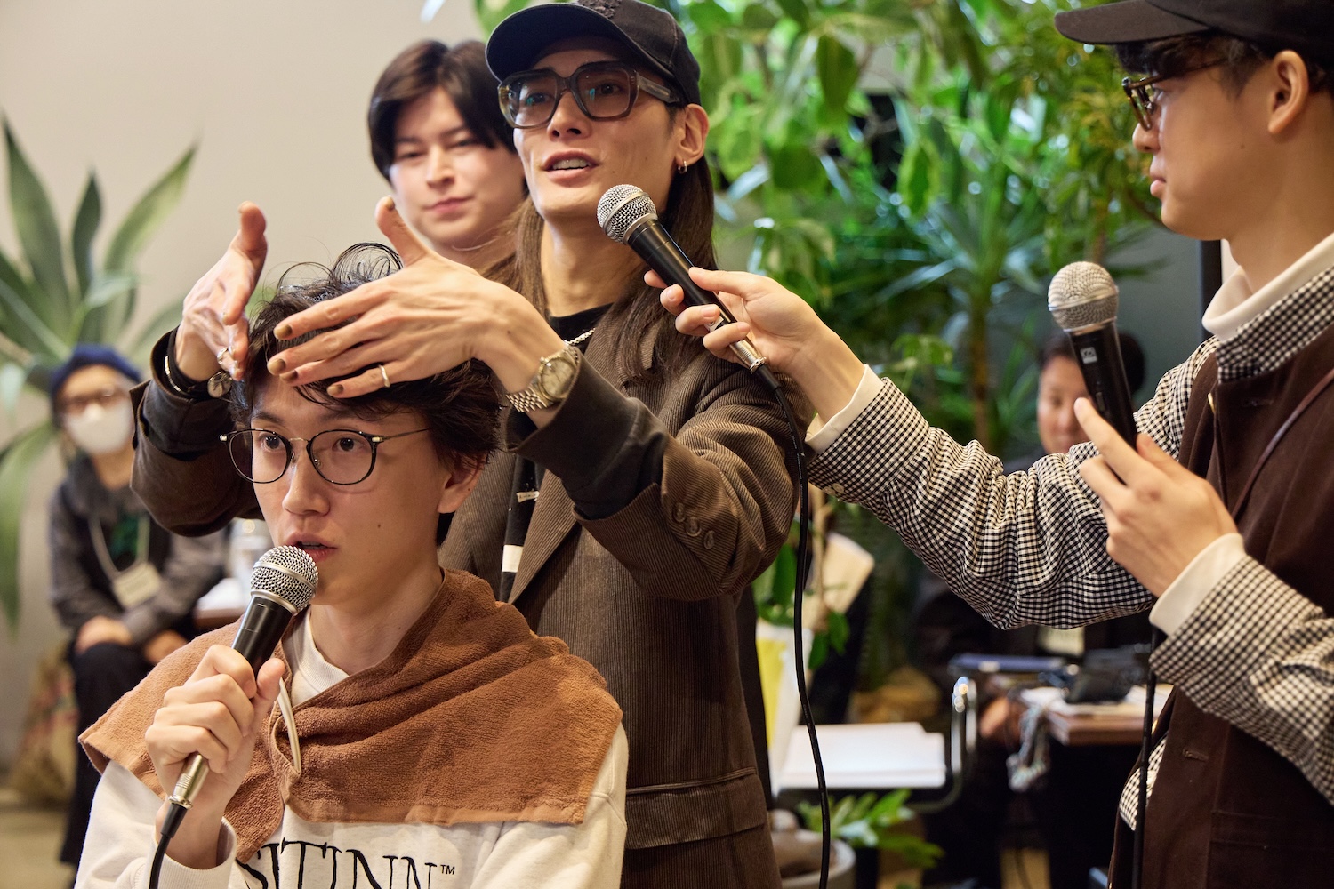 ステージに上野くん、三木くんが登壇。人気のヘアサロン『フィフス』のスタイリスト堀雄大さんを招いて二人のヘアスタイリングを開始!