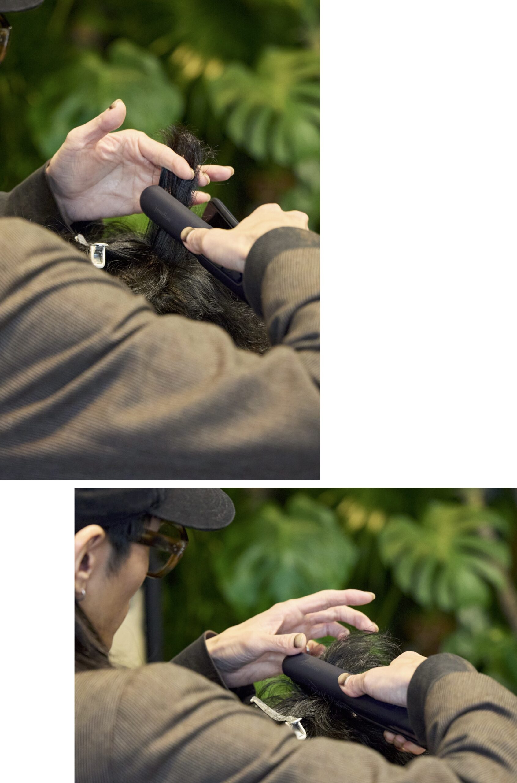 今回、2人のヘアセットに使うのは《ジュエリオン》のヘアアイロン。約二億個のマイナスイオンを発生する装置を搭載し、パサつきがちなヘアアイロン後の髪の毛をしっとりとしたツヤ髪に仕上げてくれる一品だ。約二時間でフル充電できて最大40分間稼働してくれる上に約260gと軽量なつくりなので旅先での使用にもピッタリ。別売りの充電台があればスペースを使わずに充電&収納が可能だ。