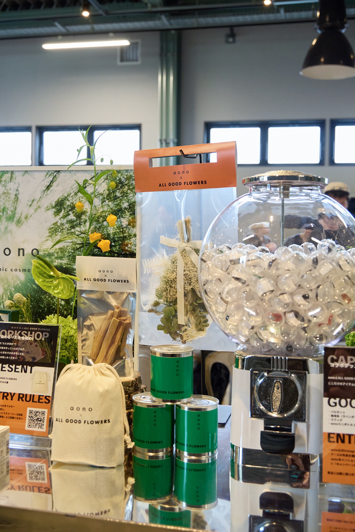 会場内ではSNSでブースの写真をアップするなど条件を満たすとガチャガチャを回せるキャンペーンを実施。会場である『シェアグリーン』内にある”花のセレクトショップ”『オール グッド フラワーズ』とのコラボレーションアイテムがもらえるという内容だ。そのラインナップはブランドイメージカラーのグリーンをベースにした特別仕様のスワッグやシード缶、パロサントなど豪華なものばかり。三木くんもやってみることに。