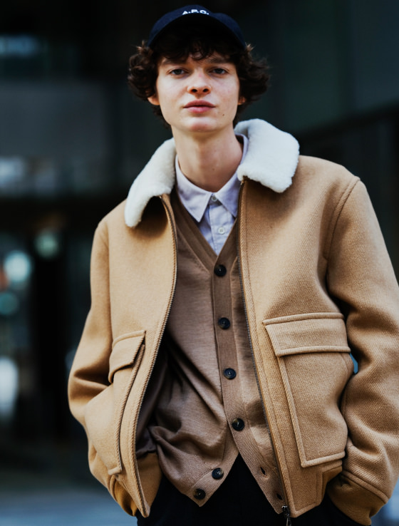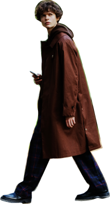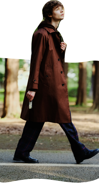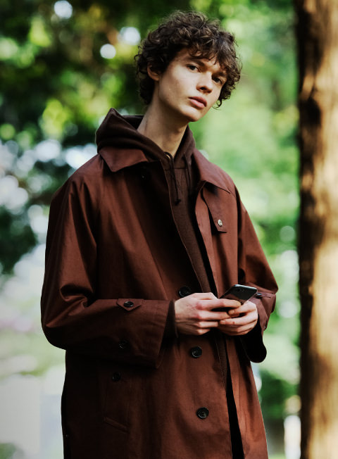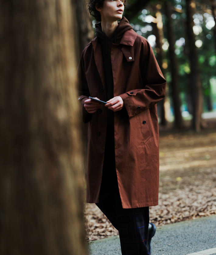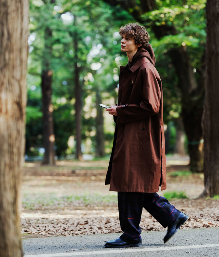 マッキントッシュのコートは従来のゴム引きコートの佇まいはそのままに、RAINTECファブリックを使用し、生地間に透湿防水フィルムを挟むなど急な雨天にも対応。チェックのテーパードパンツとあわせ、英国紳士的な組み合わせを、パーカ使いでボーイズ風に。